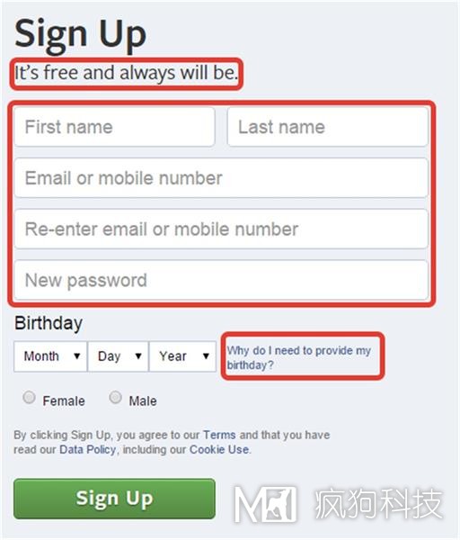 Facebook 會(huì )關(guān)注在登錄頁(yè)面與用戶(hù)操作相關(guān)的所有問(wèn)題。他們在下面的頁(yè)面中解釋了這項服務(wù)是免費的(永久的),并且如果你對填寫(xiě)出生日期感到疑惑,那么它也會(huì )告訴你需要填寫(xiě)它的原因。他們在表單及其字段中使用清晰的標簽和解釋?zhuān)康氖窍脩?hù)任何潛在的輸入問(wèn)題。
